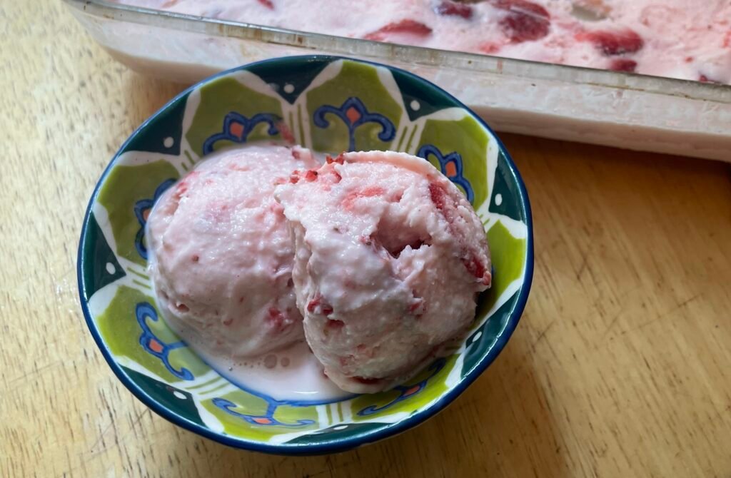 A few hours later: a tangy, creamy, treat packed with strawberry flavor. No machine, no fuss