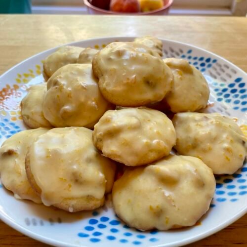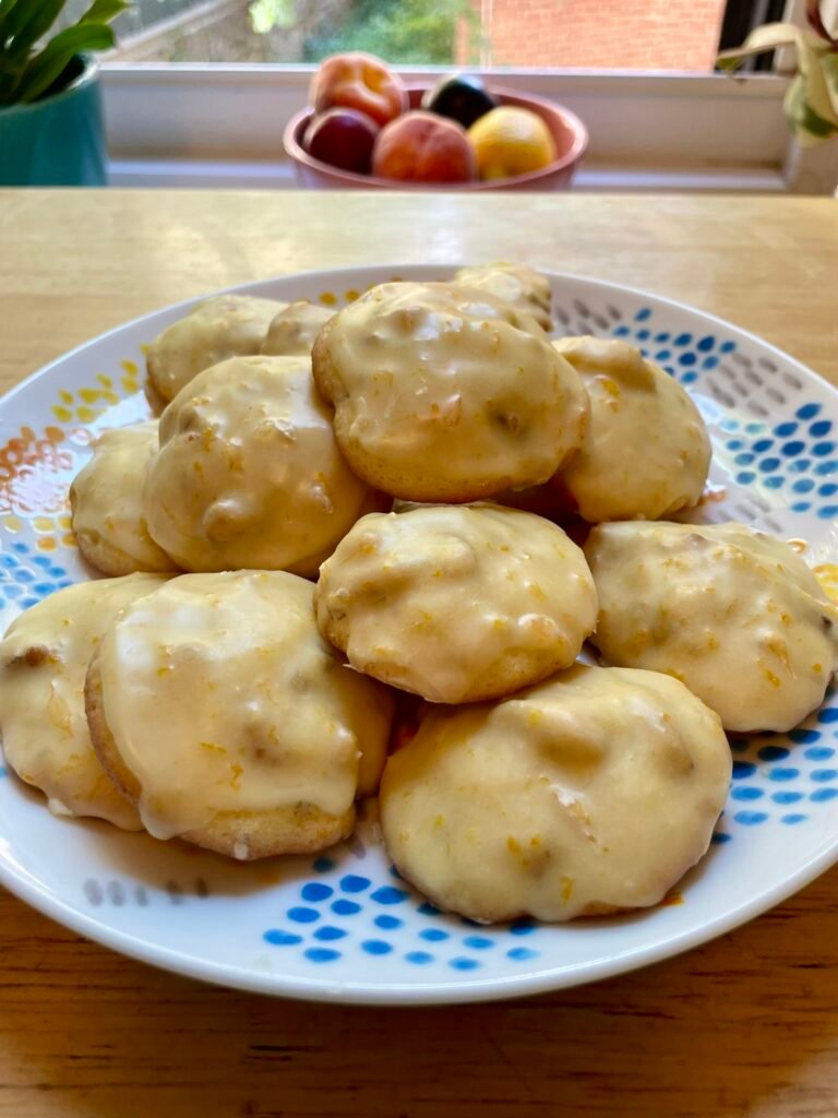- While cookies cool, make the glaze: whisk together powdered sugar, orange juice, orange zest, vanilla, and salt. Adjust with more sugar or juice to achieve a consistency that will cling to the cookies without running off.