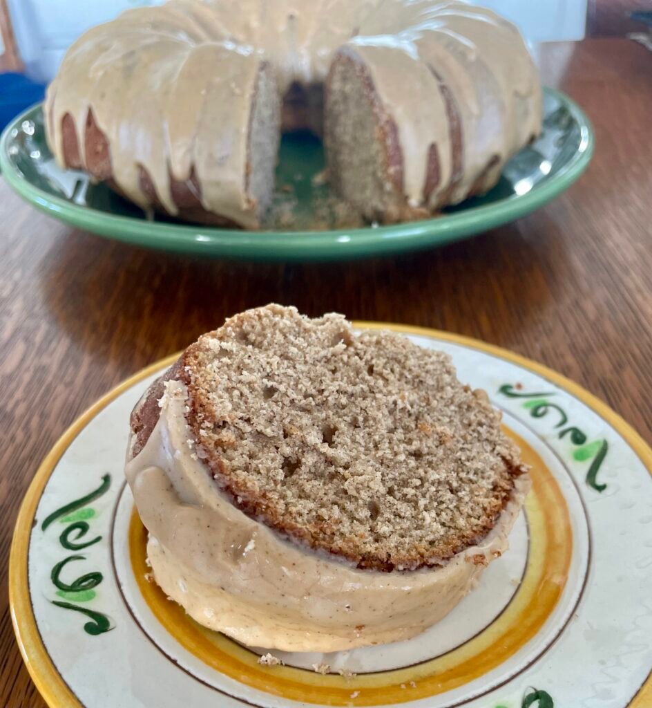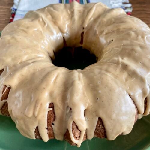 Pour the batter into a well-prepared bundt or tube pan and bake according to the recipe instructions. Allow the cake to cool completely before finishing with a spiced coffee glaze.